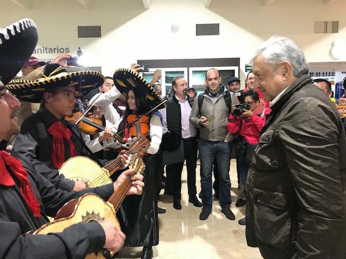 El precandidato a la Presidencia de México por el partido Movimiento de Regeneración Nacional (Morena) mostró el gorro con la leyenda “AMLOVICH” a su llegada al aeropuerto de Durango donde fue recibido con mariachis y regalos por parte de sus simpatizantes.