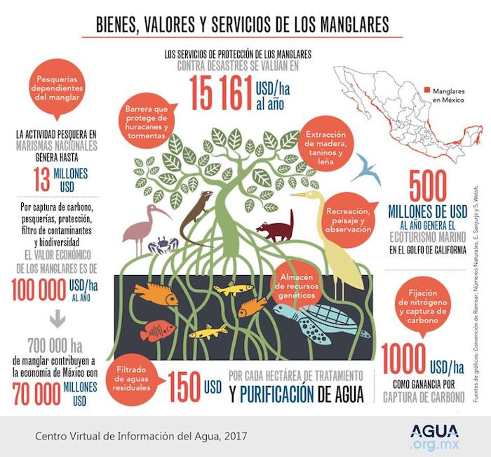 Los servicios que prestan son difíciles de monetizar, pero distintas valoraciones señalan que en términos económicos es más factible la conservación del ecosistema, que invertir en costosas plantas de tratamiento o infraestructura destinada a hacer lo que los manglares hacen de manera natural.