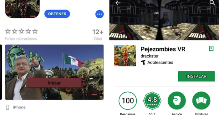 Los gráficos de la aplicación muestran un escenario ficticio en el que supuestos zombies se arrastran hacia una urna con votos, mientras en las paredes se muestras imágenes del pre candidato de Morena, del Presidente venezolano Nicolás Maduro y el fallecido Hugo Chávez.