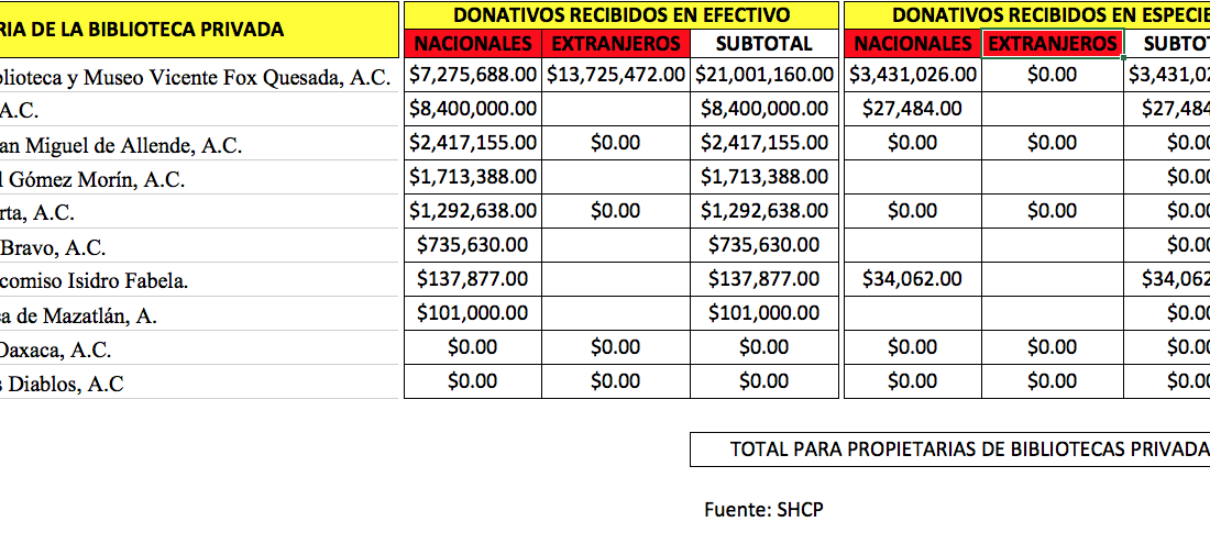 El año pasado, su colección recibió 24 millones 432 mil 186 pesos, lo que representa el 62.18 por ciento del total captado por instituciones que adueñan libros dispuestos para todos. La mayor aportación, de 13 millones 725 mil 472 pesos, vino del extranjero. La cantidad recibida por el ex Mandatario dista de los cero pesos que recibió el Salón de la Fama de los Diablos A.C. y los cero que tuvo el Museo del Deporte en Oaxaca, A.C.  Incluso es más que los poco más de ocho millones que recibió la Biblioteca Henestrosa.
