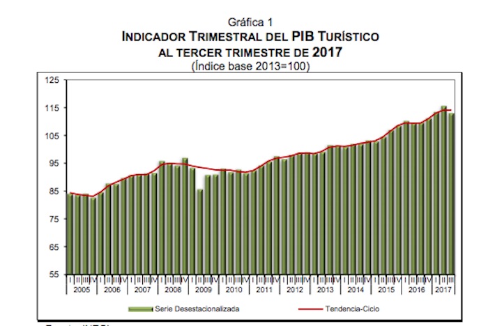De julio a septiembre de 2017, el consumo de los turistas tanto extranjeros como nacionales cayó 1.9 por ciento, mientras que el Indicador Trimestral del PIB Turístico disminuyó 2.23 por ciento, la caída más pronunciada desde el segundo trimestre de 2009.