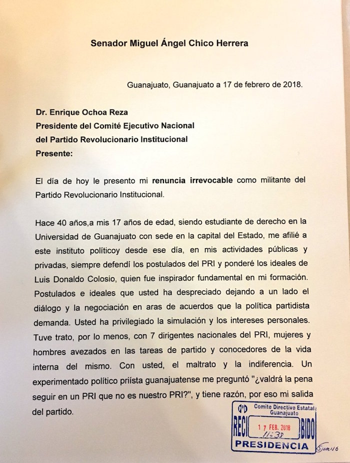 Guanajuato, Guanajuato/Ciudad de México, 17 de febrero, (ZonaFranca/SinEmbargo).- El Senador Miguel Ángel Chico Herrera anunció que se suma a la campaña del candidato a la Presidencia de la República, Andrés Manuel López Obrador, luego de presentar su renuncia a la militancia priista.