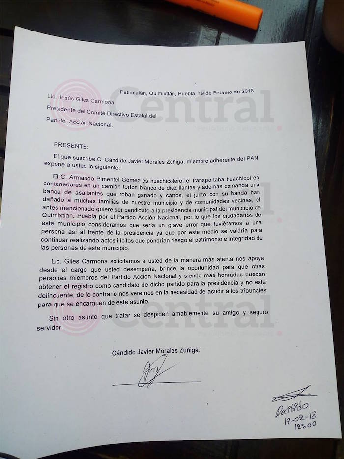 Un militante del Partido Acción Nacional (PAN) en Puebla, denunció que el precandidato a la Alcaldía de Quimixtlán, Armando Pimentel Gómez, encabeza una banda delictiva que roba ganado y es huachicolero.