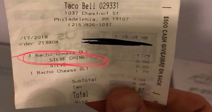 Al momento de recibir el ticket de su compra y revisarlo minuciosamente, se dio cuenta que el empleado que le tomó la orden efectivamente escribió Steve, pero acompañado de la palabra “Chink”, término que se utiliza para referirse de forma peyorativa a las personas de ascendencia asiática.