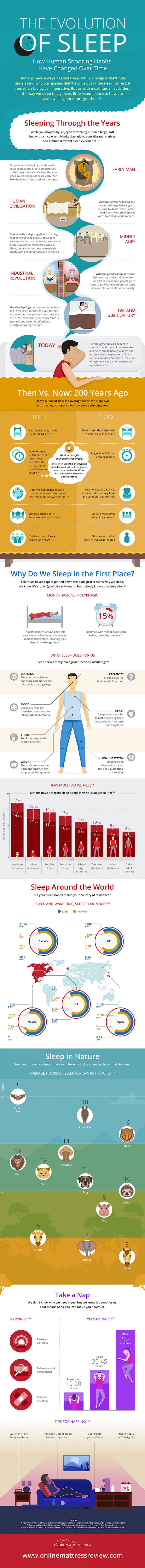 Para que te imbuyas de conocimiento relativo al arte de dormir, hoy te traemos una infografía elaborada por los especialistas en colchones de Online Mastress Review. En ella encontrarás datos esenciales como la evolución del sueño: mientras que al comienzo de la existencia humana la vida se centraba en la lucha para encontrar alimento para la supervivencia y dormíamos en “nidos terrestres”, acurrucados en posiciones fetales, puntos de inflexión como la revolución industrial y la proliferación de fuentes de luz eléctrica cambiaron los hábitos y la calidad del sueño cobró mayor relevancia ligado a la productividad.