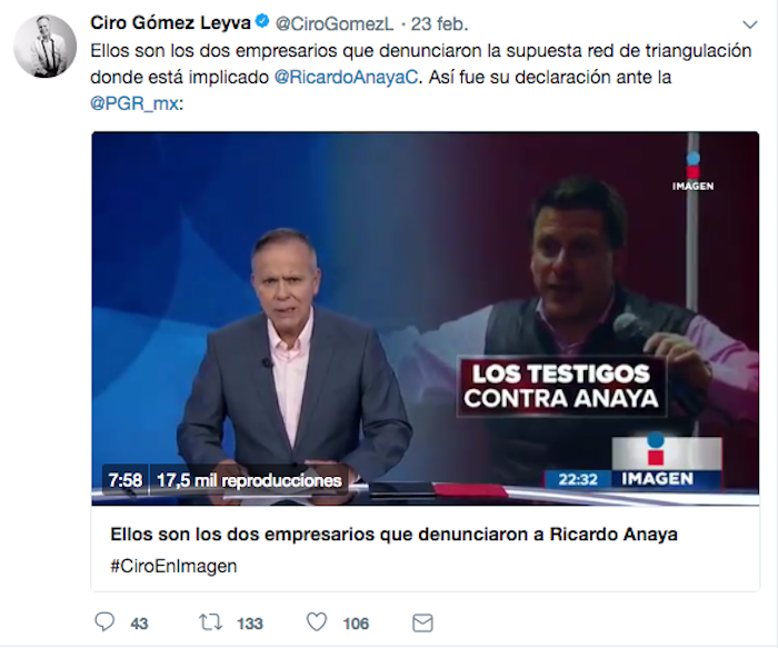#MetaDatos | El pasado 23 de febrero, el periodista Ciro Gómez Leyva difundió un video en el que dos empresarios señalaron a Ricardo Anaya de ser el beneficiario de delitos de lavado de dinero. La información fue retomada por la agencia Apro, del semanario Proceso, lo que en Twitter generó una tendencia [un tema mencionado al infinito].