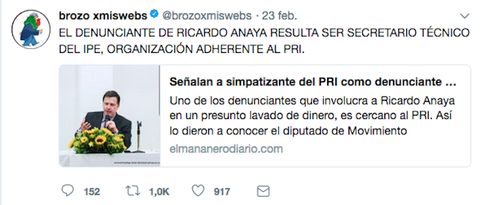 Ciudad de México, 27 de febrero (SinEmbargo).– La implicación en delitos de lavado de dinero de Ricardo Anaya Cortés modificó los mapas electorales en Twitter. En menos de una semana, el panorama es otro en esa red social, después de la noticia de que el candidato habría triangulado fondos en paraísos fiscales y lavado dinero en empresas fantasma. Para estas acciones, uno de sus principales vínculos habría sido el empresario queretano Manuel Barreiro Castañeda.