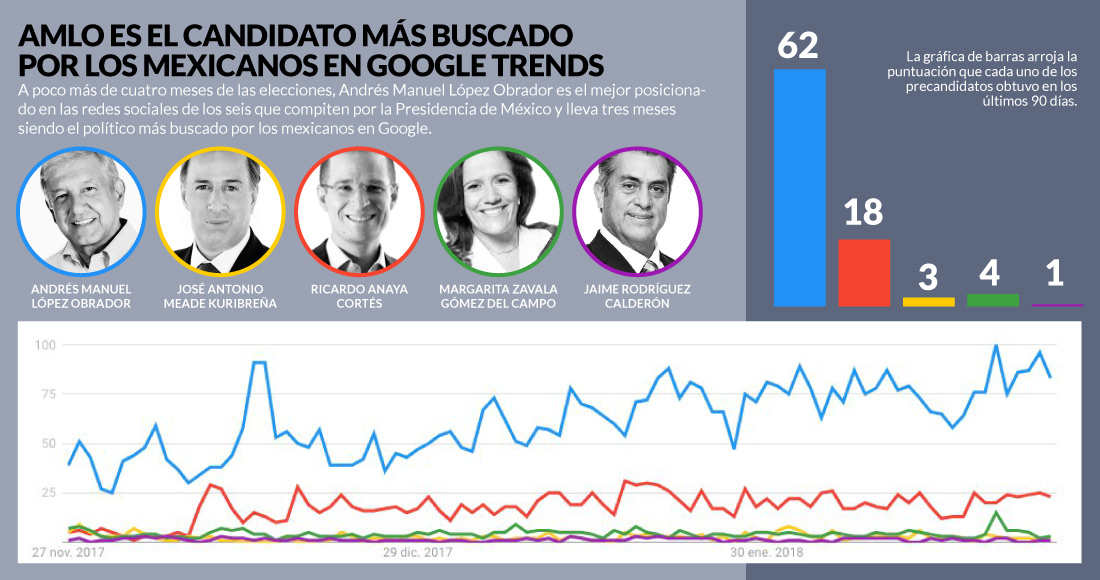 En 12 octubre del año pasado, cuando inició el rastreó de Bloomberg, el político tabasqueño llevaba 39.30 por ciento. Su nivel más bajo de intención del voto se registró el 21 de noviembre con el 30.40 por ciento, el mismo porcentaje que alcanzó el panista Ricardo Anaya.