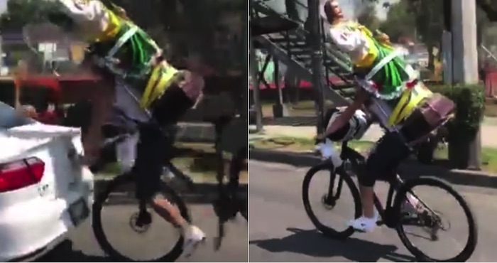 El hombre cargaba una figura gigante de San Judas Tadeo en su espalda, mientras viajaba a todo velocidad en su bicicleta, pero una distracción causó un grave accidente que provocó que su santo quedara hecho polvo.