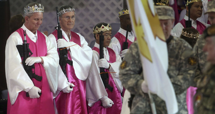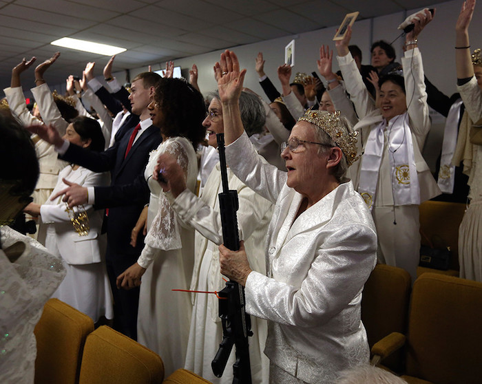Primero, los líderes del culto instaron a los parroquianos a que descargaran sus rifles antes de la ceremonia. A continuación mujeres vestidas de blanco y hombres con trajes oscuros desfilaron con sus armas, muchas de las cuales eran AR-15 y sus modificaciones.