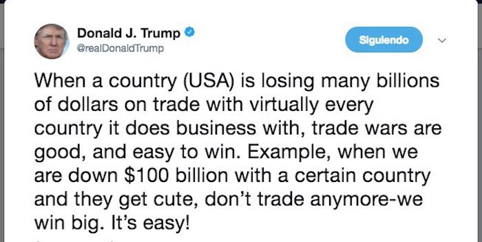 “Cuando un país (EU) pierde muchos miles de millones de dólares en el comercio con prácticamente todos los países con los que hace negocios, las guerras comerciales son buenas y fáciles de ganar. Ejemplo, cuando tenemos déficit de 100.000 millones con cierto país y ellos se ponen burlones, no comerciar más: ganamos en grande ¡Es fácil!”, publicó el mandatario.