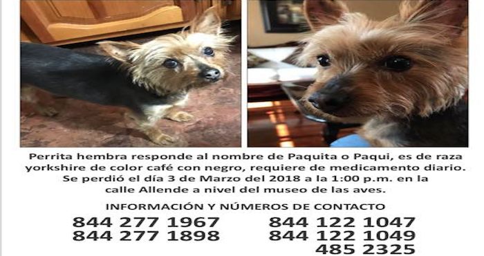 “Paquita”, una perrita yorkshire que apoya en terapias infantiles, desapareció el pasado 3 de marzo en la calle Allende de Saltillo. Desde entonces su familia emprendió su búsqueda con anuncios y videos en Facebook que se hicieron virales; al principio ofrecieron una recompensa de 20 mil pesos que ya aumentó a 25 mil.