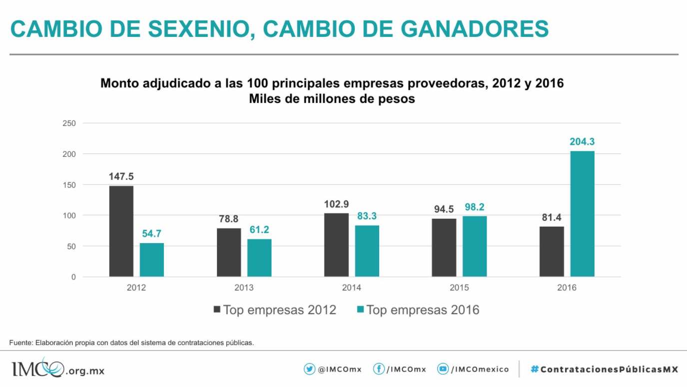 De acuerdo con el estudio "El Sistema Mexicano de Contrataciones Publicas" realizado por el Instituto Mexicano para la Competitividad (IMCO), 2 mil 512 proveedores, que son el 1.9 por ciento de los 129 mil 411 proveedores, concentraron el 80 por ciento del monto total destinado a compras públicas.