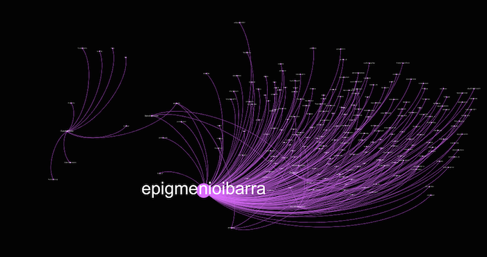 Grafo obtenido a partir de 2 mil 462 nodos y 4 mil 251 aristas donde se observa la interacción del activista y productor Epigmenio Ibarra en los dos temas relacionados con Ayotzinapa que fueron tendencia este lunes.