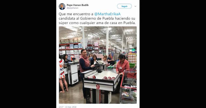 Puebla/Ciudad de México, 14 de marzo (Periódico Central/SinEmbargo).- El empresario y periodista de deportes en Puebla Pepe Hanan, intentó emular al periodista Joaquín López Dóriga y posteó en su cuenta de Twitter una foto para informar a sus seguidores que se había encontrado a la candidata de "Por Puebla al Frente", al gobierno del estado, Martha Erika Alonso como una persona común y corriente que asiste a hacer sus compras al súper.
