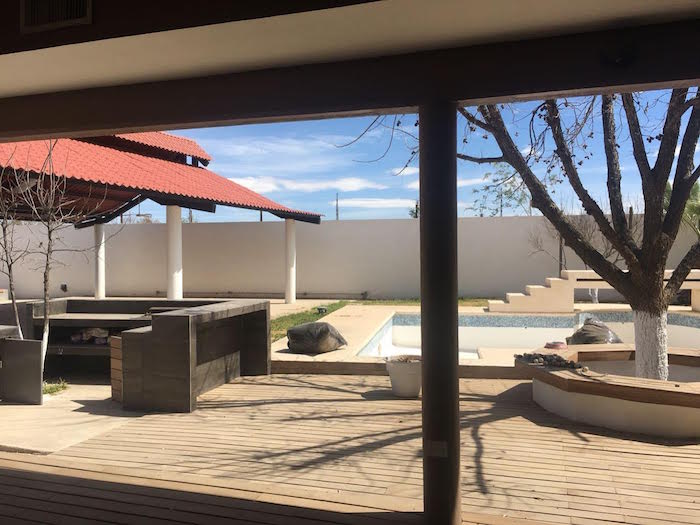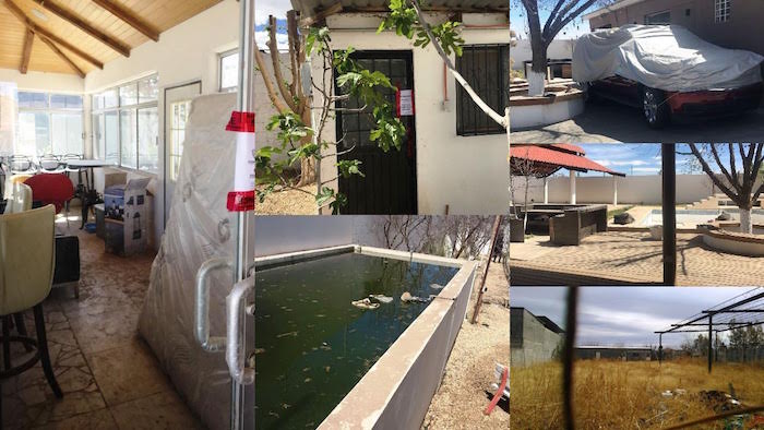 La Granja de la calle Texas número 9403, Robinson II, tiene una extensión aproximada de 2 mil 500 metros cuadrados; cuenta una edificación de una sola planta– de 150 metros cuadrados de construcción–; tiene recibidor o estancia, cuarto de dormir, centro de entretenimiento y baño completo; corrales para aves, alberca de 6×12 metros, asador, palapa, baño exterior (sin regaderas), pila de agua para riego de árboles frutales y bodegas.