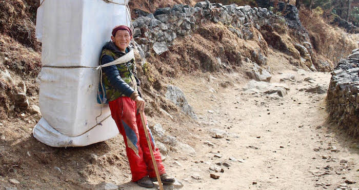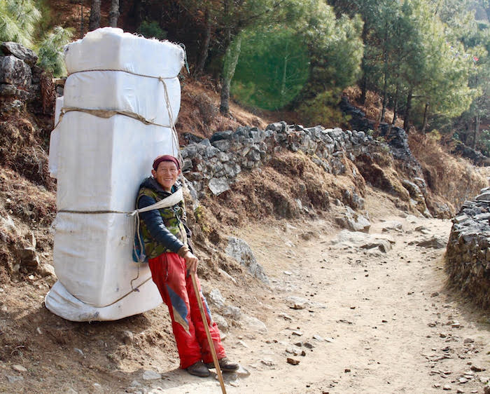 Los maleteros caminan todo el día –a veces durante días– y son hábiles como serpientes, se deslizan por caminos empinados transportando cualquier cosa a las aldeas suspendidas en la altitud: papel de baño, agua embotellada, mierdas con azúcar, medicinas, güisqui, ron, cerveza, papas fritas, mierdas selladas en bolsas de plástico, cosas que los turistas tachamos de básicas –y, por lo tanto, necesarias–: llevan misceláneas enteras en la espalda para que el comercio no deje de fluir. También llevan pedazos de infraestructura: tubos de drenaje, sillas de metal, cubetas, docenas de varillas de acero, fregaderos de cocina, retretes estándares porque a los westerners nos incomoda cagar de cuclillas.