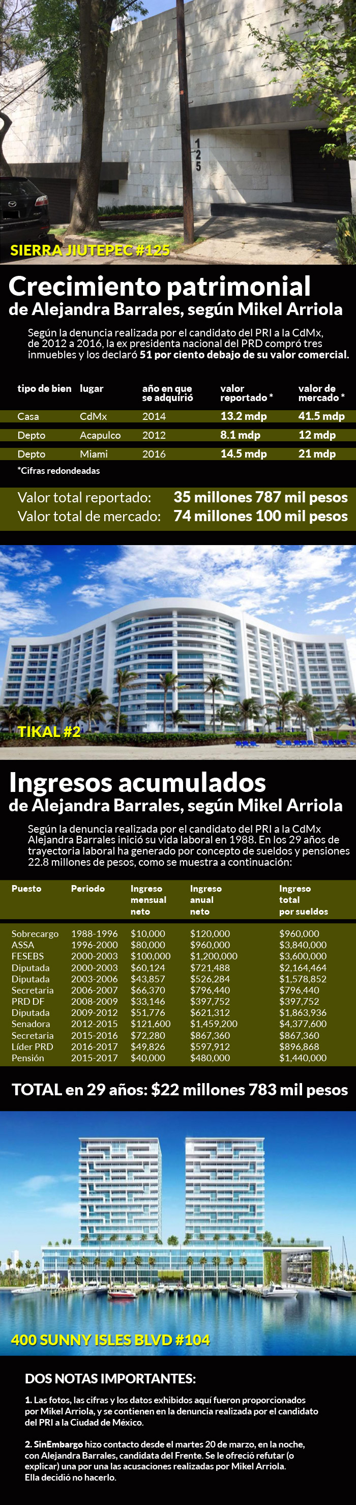 Alejandra Barrales Magdaleno, candidata de la coalición “Por México al Frente” para la Jefatura de Gobierno de la Ciudad de México, con un ingreso en 29 años de trabajo de 32.5 millones de pesos, posee hoy un lujosa casa en Lomas de Chapultepec, un departamento en Acapulco, Guerrero, y otro más en Miami, Florida, Estados Unidos, que suman un valor de 73.5 millones de pesos, además de 22 millones de pesos en el banco, lo que significa una fortuna en total de 96.6 millones de pesos, acusa Mikel Arriola Peñalosa.