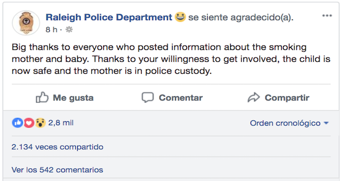 “Un enorme agradecimiento a todos los que publicaron información sobre la madre y el bebé fumadores”, dijeron los agentes del departamento en una publicación en Facebook. “Gracias a su disposición para intervenir, el niño ahora está a salvo y la madre fue detenida”.