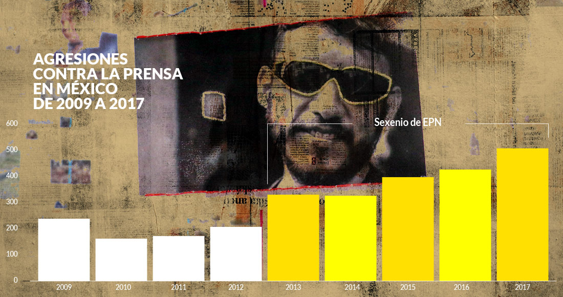 La organización que cumple diez años con presencia en México, documenta 507 agresiones contra periodistas y 12 asesinatos en 2017, año de estudio del informe. Así, a lo largo del sexenio de Enrique Peña Nieto se han registrado mil 986 agresiones, contabiliza, y se ha convertido en el más violento del siglo XXI en México.