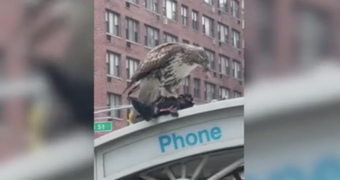 Ciudad de México, 24 de marzo (RT/SinEmbargo).- En una calle de Manhattan, Nueva York, Estados Unidos, un fotógrafo neoyorquino realizó recientemente un sorprendente video que fue publicado este martes por Yahoo Noticias. Las imágenes muestran un halcón que caza, somete y devora una paloma. La presa, que intenta escapar de su captor, no logra librarse y termina pereciendo encima de una cabina de teléfonos.