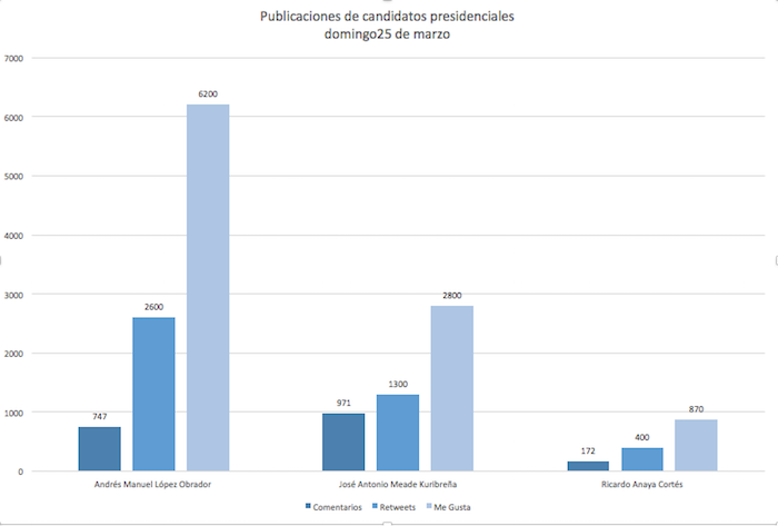 Con este mensaje, Andrés Manuel tuvo un alcance de dos mil 600 retweets hasta el corte de esta nota, la mayor respuesta que los tuiteros dieron a un candidato presidencial durante este fin de semana. Pero el tweet no alcanzó a colocarse en tendencias. El análisis realizado por esta unidad arrojó que López Obrador llamó el interés de la gente, pero este no se concentró en el tema que el candidato puso en la mesa. Los comentarios que los usuarios realizaron sobre su publicación se enfocaron a temas relacionados con el candidato y no con el contenido del tuit.