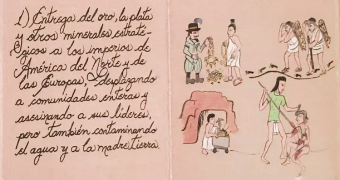Es una denuncia por la desaparición forzada de los 43 estudiantes de la Escuela Normal Rural Raúl Isidro Burgos de Ayotzinapa, el 26 y 27 de septiembre de 2014. Tiene la forma de un códice prehispánico, plasmado –en su versión original– en papel kfrat, color café, y mide 6 metros de largo y un metro y 20 centímetros de ancho.