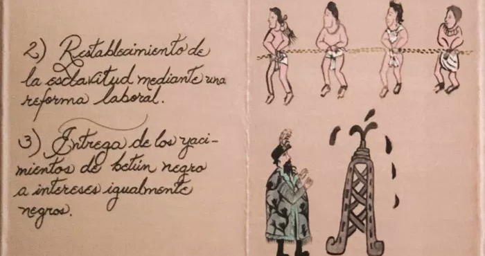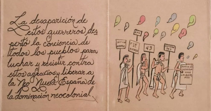 Y es también una pieza artística. En uno de sus segmentos puede leerse que este hecho no esclarecido que cimbró al país a fines de 2014, “despertó la conciencia de todos los pueblos contra estos agravios, liberar la Neo Nueva España de la dominación neocolonial”.