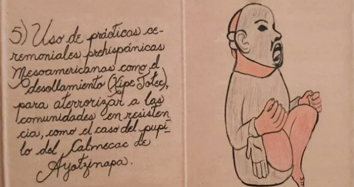 El códice de Ayotzinapa, continúa la doctora, “es un muy buen ejemplo de este tema, no sólo en el uso del patrimonio mesoamericano, por ejemplo, imágenes de los códices del virrey Antonio de Mendoza y el Manuscrito de Aperreamiento, sino también en su narrativa: las atrocidades del Estado que afectan a pueblos rurales y marginalizados”.