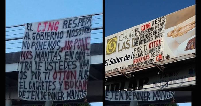 "El CJNG respeta al gobierno, no ponemos mantas en contra de ustedes, vamos por ti Othon, alias Cachetes y Bukanas, dejen de poner mantas", dice el mensaje que utiliza una caligrafía clara y pintura de color negra y roja."