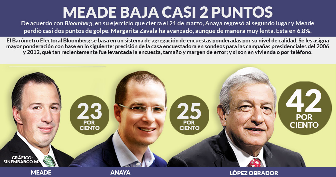 El Barómetro Electoral que realiza Bloomberg se basa en un “sistema de agregación de encuestas ponderadas por su nivel de calidad. Se les asigna mayor ponderación con base en lo siguiente: precisión de la casa encuestadora en sondeos para las campañas presidenciales del 2006 y 2012, qué tan recientemente fue levantada la encuesta, tamaño y margen de error de las muestras; También los sondeos realizados en vivienda reciben mayor peso que aquellos por teléfono”.