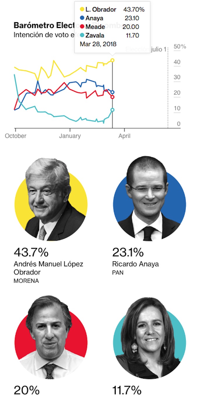 Andrés Manuel López Obrador alcanzó su nivel más alto desde diciembre en el rastreo de las encuestas de Bloomberg. Con 43.70 por ciento de la intención del voto se colocó ya 20 puntos arriba de su más cercano contendiente, el panista Ricardo Anaya, quien perdió puntos y se ubicó en 23.10 por ciento.