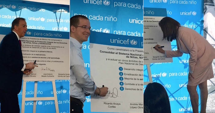 Ciudad de México, 5 de abril (SinEmbargo).- Como parte del trabajo del Fondo de las Naciones Unidas para la infancias (Unicef) de promover los derechos de los infantes y adolescentes en el centro de las agenda nacional y en la plataformas políticas, este día tres de los presidenciables firmaron un compromiso con el organismo.