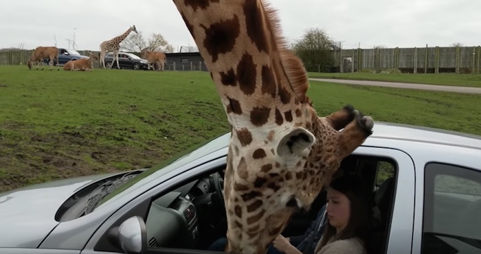 En el video se puede observar como la jirafa introduce su cabeza dentro del coche de una joven pareja y mientras la mujer que estaba en el asiento del copiloto reía, ésta trata de cerrar la ventana, pero la jirafa salió de repente e hizo estallar el vidrio, causando el asombro de los tripulantes del auto vecino.