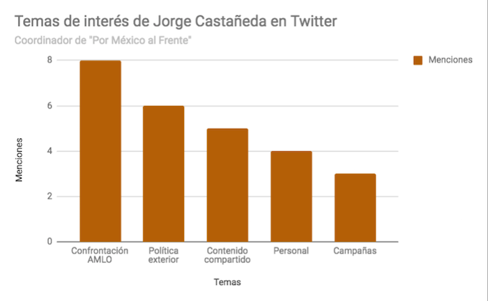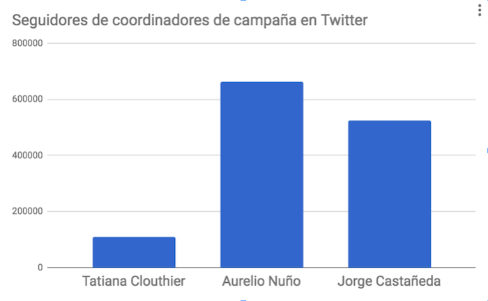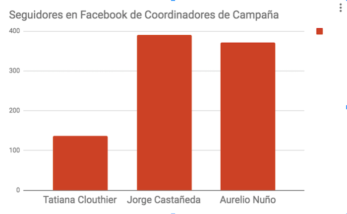 Jorge Castañeda, coordinador de campaña de Ricardo Anaya Cortés, alcanzó mayor visibilidad a partir de la mitad de marzo, cuando se sumó a la coalición de “Por México al Frente”, de acuerdo a la herramienta Google Trends. Su número de seguidores en Twitter y Facebook es equiparable a los de Aurelio Nuño, pero en las últimas semanas ha publicado menos contenido que el priista. Ambos coinciden en confrontar a López Obrador de manera constante.