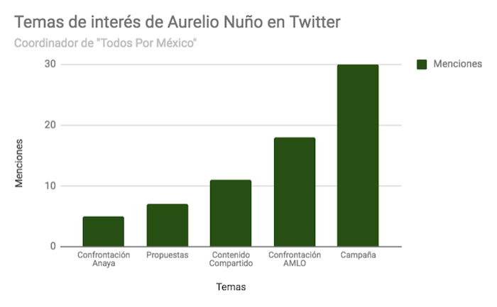 Aurelio Nuño es uno de los integrantes de la coalición “Todos Por México” más participativos en redes sociales. En las publicaciones del Coordinador prevalecen constantes que se han mantenido fijas desde el inicio de este año. El tono formal para dirigirse a sus seguidores y la confrontación en mayor medida hacia López Obrador, pero también hacia Ricardo Anaya, son sus principales características.