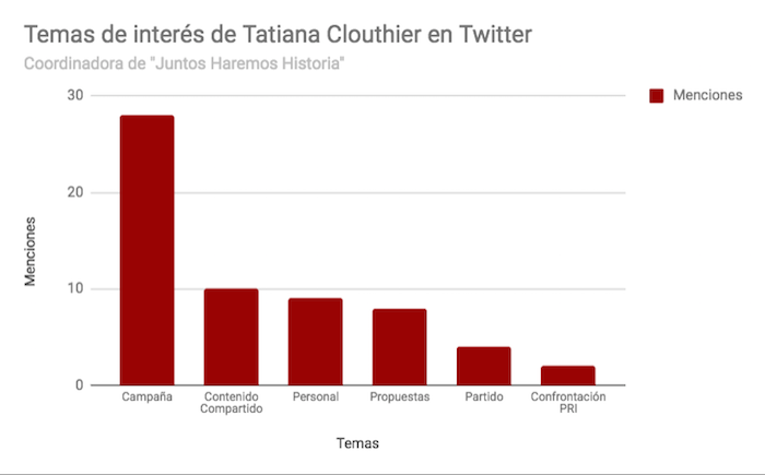Según las estadísticas arrojadas por Google Trends, la popularidad en la Red de la Coordinadora de campaña de Andrés Manuel López Obrador comenzó a crecer a partir de enero de este año. El interés fluyó no sólo tras formalizarse su nombramiento al frente de la campaña, sino por la simpatía que generó entre los seguidores del Movimiento de Regeneración Nacional (MORENA). Junto a la politóloga arribaron a la estrategia de Obrador actores más identificados en la esfera pública, entre ellos Marcelo Ebrard y Ricardo Monreal. Clouthier partió de prácticamente cero en popularidad en las redes sociales hasta convertirse en uno de los miembros de la coalición “Juntos Haremos Historia”, con mayor capacidad de influencia. Esto debido a una estrategia que recurre en ocasiones al humor, elemento que en el entorno mexicano se encuentran por norma fuera de la rigurosa etiqueta política.