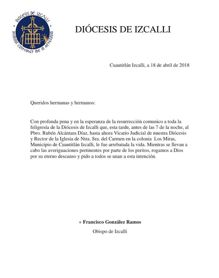 Rubén Alcántara Díaz, sacerdote de la parroquia Nuestra Señora del Carmen, ubicada en el municipio Cuautitlán Izcalli, Estado de México, fue asesinado la tarde de ayer. Con él suman 22 sacerdotes asesinado desde 2013 en México.