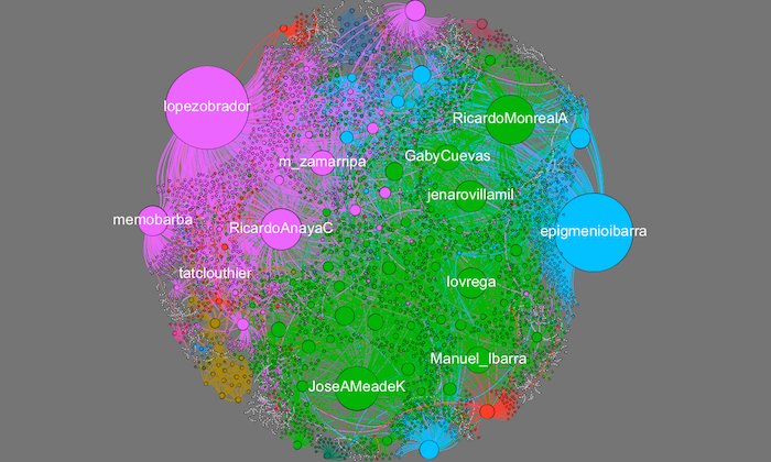 Este segundo gráfico está contuido a partir de 7 mil tuits y fue realizado una hora despuésd el relación a la conversación por AMLO. Se observa que los usuarios influyentes cambiaron. Ricardo Anaya y José Antonio Meade son mencionados en frecuentes ocasiones en relación a López Obrador.