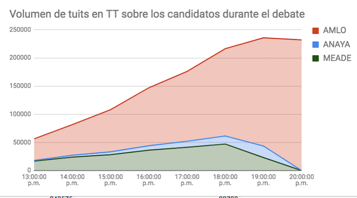 La tendencia se interrumpió en los primeros veinte minutos del debate. Un tema único se impuso. No se trató de un asunto concerniente a la problemática nacional. AMLO fue el eje temático. Sus adversarios, con excepción de Margarita Zavala, lo criticaron, señalaron y cuestionaron. Su actitud de pasividad no contribuyó a mantener la tendencia marcada antes del inicio del debate. Mientras, la burla y la jiribilla en torno al evento en sí y a los contendientes se desbordaba a través de memes y mensajes.