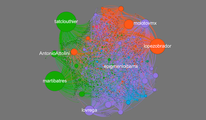 El primer gráfico está constuituido a partir de 4 mil tuits de la tendencia #MéxicoConAmlo y muestra a los principales actores. Aquí se ve que Tatiana Clouthier era protagonista.
