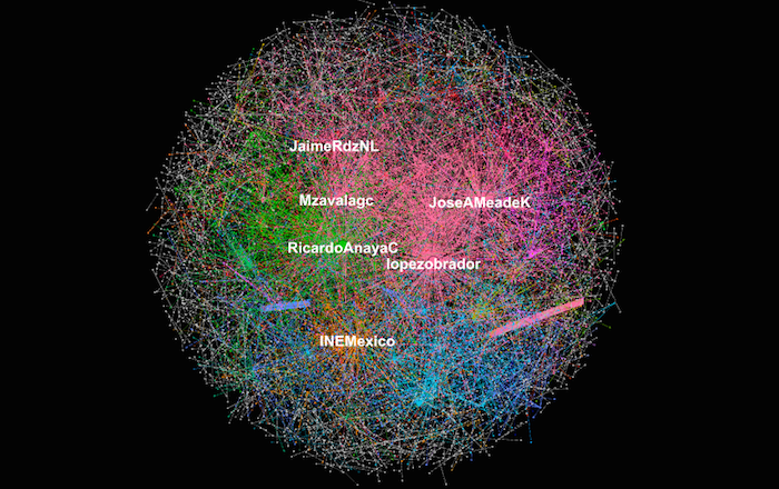 Muestra obtenida de 6 mil tuits con el hashtag #DebateINE recolectados durante el debate y donde se muestra la presencia de los candidatos. Foto: SinEmbargo