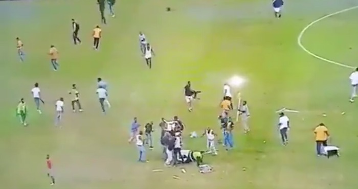 En los videos grabados por los testigos se observa como los aficionados incontrolados provocan destrozos en el estadio y atacan a los guardias de seguridad. De acuerdo con los medios locales, una mujer policía resultó gravemente herida después de que un grupo de fanáticos la tirara al suelo y le propinara sillazos y patadas en la cabeza. Se informa también de varios otros heridos durante el episodio de violencia.
