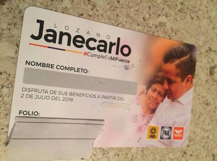 La imagen de la tarjeta de plástico indica que “se activará” un día después de la elección del primero de julio, sólo si la alianza (el Frente) de Janecarlo Lozano sale vencedora: “Disfruta de sus beneficios a partir del 2 de julio de 2018”, promete el candidato.