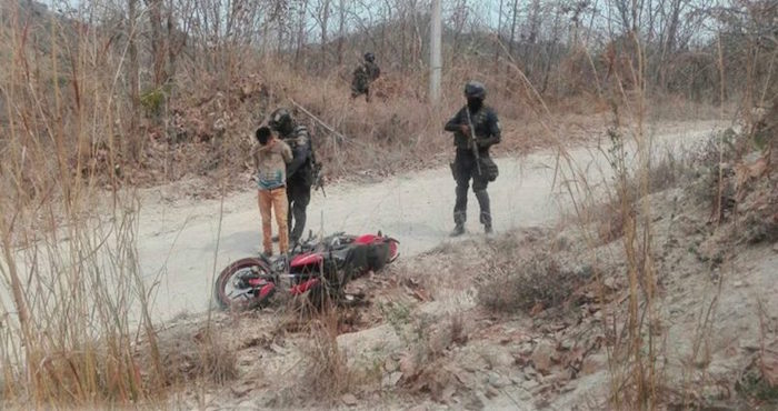 En un comunicado, la dependencia indicó que en un recorrido, policías estatales y soldados aseguraron en una brecha de terracería del poblado La Barranca al hombre de 19 años de edad, identificado como Roberto, quien iba en una motocicleta y cayó al tratar de huir al ver el convoy.