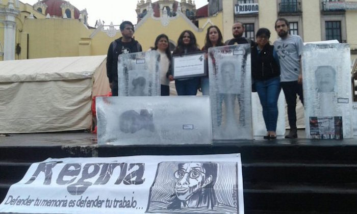 Reporteros colocaron 21 bloques de hielo con fotografías de los reporteros asesinado en el país, para conmemorar el sexto aniversario luctuoso de Regina Martínez.