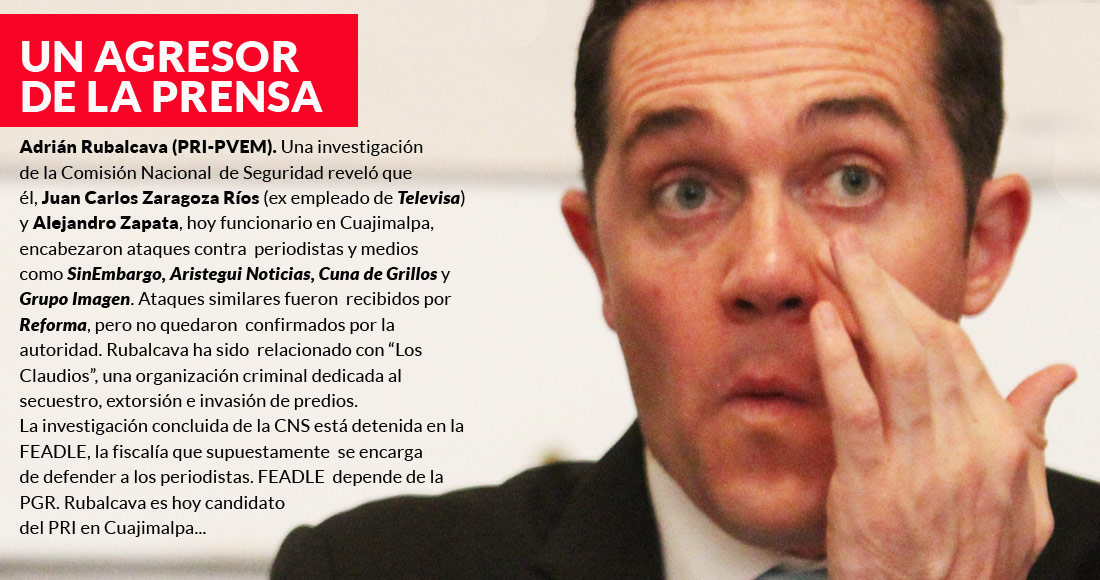 Meses antes el periodista junto a Linaloe R. Flores, también reportera de este diario digital, revelaron en una serie de reportajes que la Comisión Nacional de Seguridad (CNS) investigaba a Rubalcava Suárez, Juan Carlos Zaragoza Ríos (ex empleado de Televisa) y Alejandro Zapata, ex funcionario en Cuajimalpa, por encabezar ataques contra periodistas y medios como SinEmbargo, Aristegui Noticias, Cuna de Grillos y Grupo Imagen.