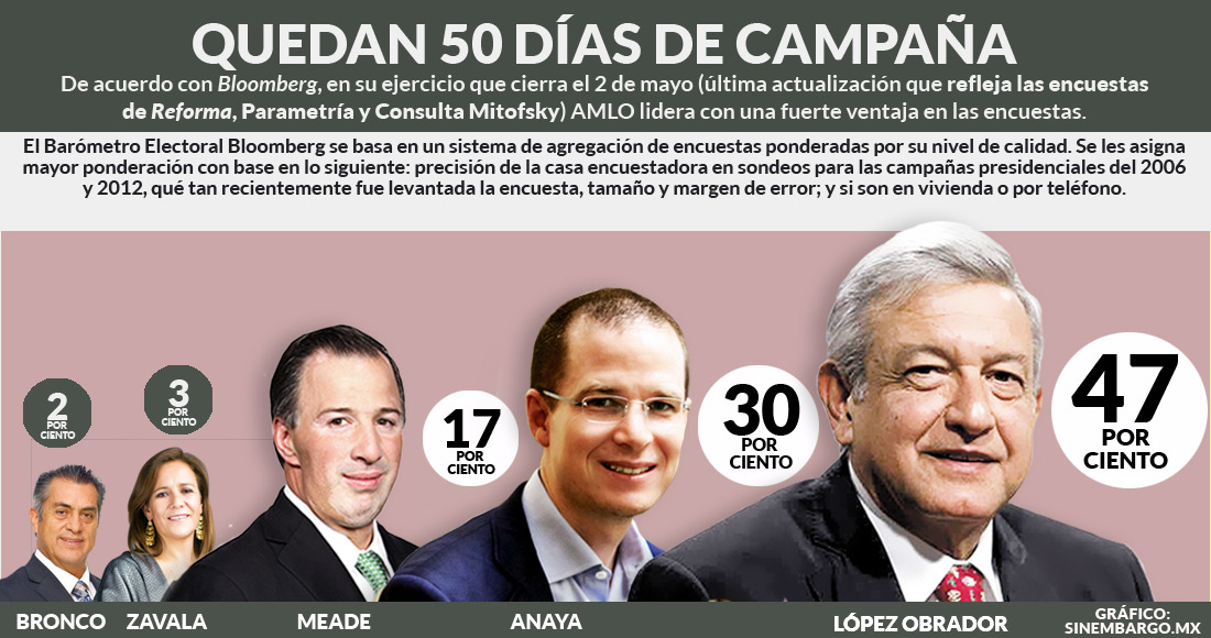 Las acusaciones se producen al tiempo que López Obrador consolida su liderazgo en las encuestas, donde ya tiene un respaldo del 47 por ciento del voto efectivo, según el Barómetro Electoral de Bloomberg, que refleja las encuestas de Reforma, Parametría y Consulta Mitofsky publicadas la semana pasada.