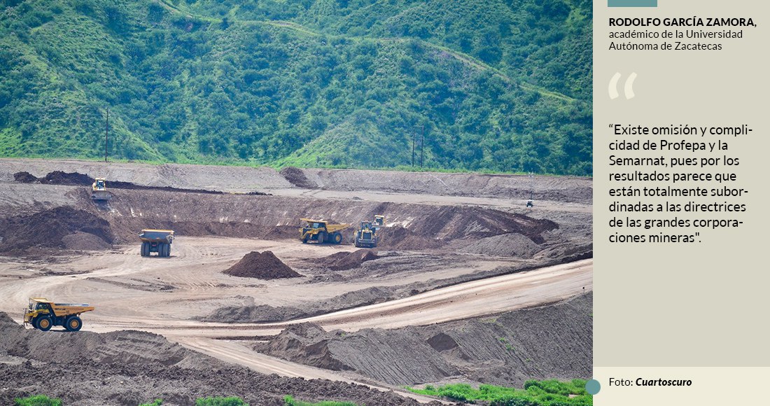 "Hay ausencia, opacidad y complicidad de las dependencias federales. Por un lado hay liberalidad de la Secretaría de Economía para otorgar el territorio nacional destinado a exploración y explotación de la minería. Por el otro existe omisión y complicidad de la Profepa [Procuraduría Federal de Protección al Ambiente] y la Semarnat [Secretaría de Medio Ambiente y Recursos Naturales], pues por los resultados parece que están totalmente subordinadas a las directrices de las grandes corporaciones mineras", criticó.