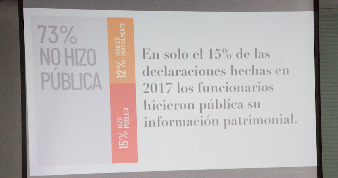 Carolina Torreblanca, coordinadora del proyecto, explicó que antes de la nueva Ley de transparencia era una prerrogativa de los funcionarios decidir no hacer pública su información patrimonial, prerrogativa que tomó el 73 por ciento de los funcionarios en 2017. Además, dijo, 12 por ciento decidió publicar parcialmente la información; es decir, omitir ciertos rubros, y solamente 15 por ciento la hizo pública.